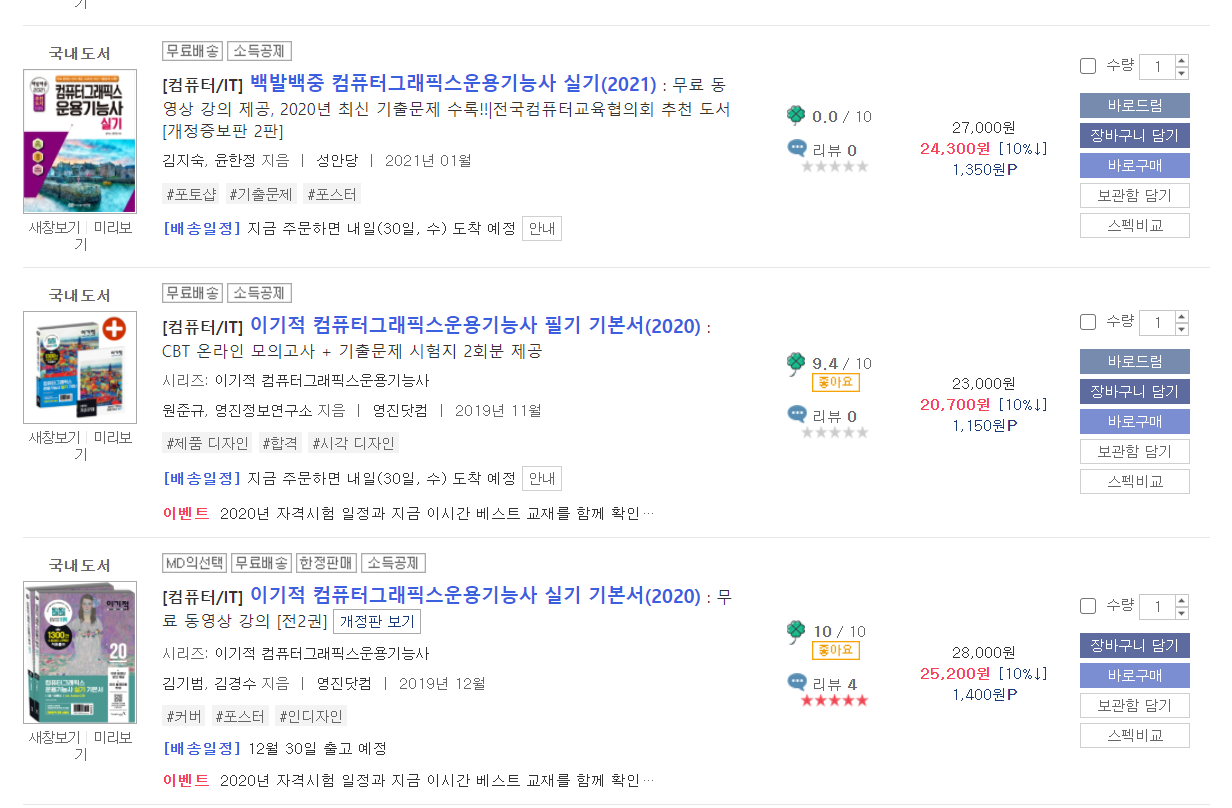 이중에 평점이 높은 책을 선정하셔서 시험일자까지 최선을 다해 공부를 하는 것을 추천 드립니다. 게다가 최근에는 출제된 문제를 풀어볼 수 있는 자료들이 큐넷과 인터넷에 꽤 많습니다.